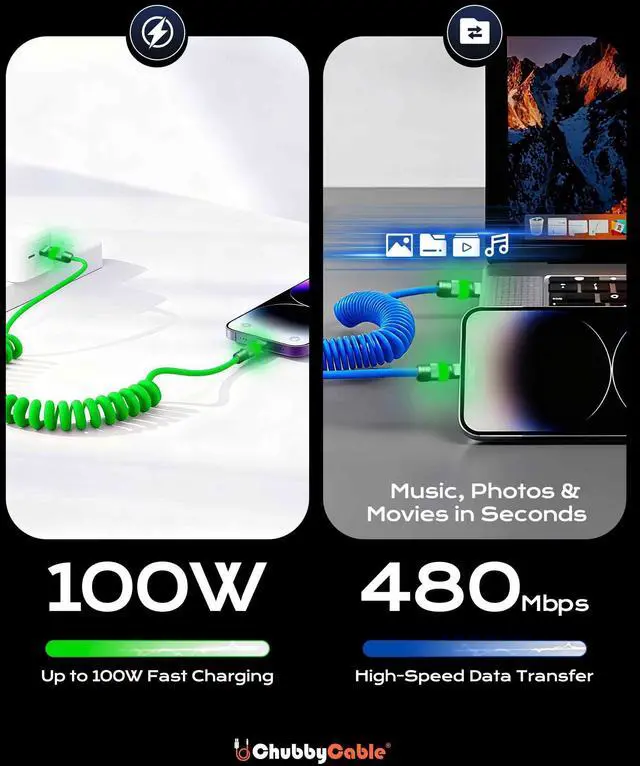 CHARGING & DATA TRANSFER: The ChubbyCable coiled USB-C cable delivers up to 100W of charging for your devices. Supporting USB 2.0 data transfer speeds up to 480 Mbps, this fast charging USB C cable allows for quick and reliable file syncing across all your compatible devices ^^