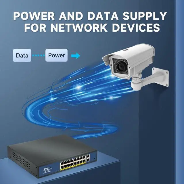 Gigabit POE SwitchIncluding 16 POE ports(10/100/1000Mbps), 2 Gigabit UpLink port(10/100/1000Mbps), Davuaz Gigabit power over ethernet switch can transmit network data and power at the same time with IEEE 802.3 af/at standard. You can connect it to all your devices, such as Computer, Laptop, routers, IP camera, IP phone, NVRs, etc. ^^ Effective POE PowerThis gigabit switch offers a maximum 250W PoE power output in total. Support IEEE 802.3 af/at, single-port POE power up to 30W, can meet power supply requirements most of your applications. Please confirm the input voltage range: 100-240V. ^^ Plug & PlayWith power detection function, the unmanaged gigabit switch will detect devices automatically. Built-in power supply makes installation easier, you just need to plug in the power cord, and connect the ethernet cable directly to the device without other configuration. So that you can enable ultra-fast wired connectivity and instant large files transferring. ^^ One-Key VLANWhen it is set to V, each POE port cannot be connected to each other but can only be connected to the UP Link port. With the one-key VLAN fuction, this kind of gigabit poe switch can effectively suppress network faults such as network storms, to ensure good network transmission performance and security. ^^ Worry-Free GuaranteeWe aim to provide customers with high quality products and 100% satisfaction. Please contact us via if any problem. You will get a solution to the problem, a hassle-free refund or a resend of new item in 24 hours.