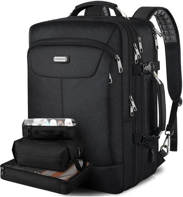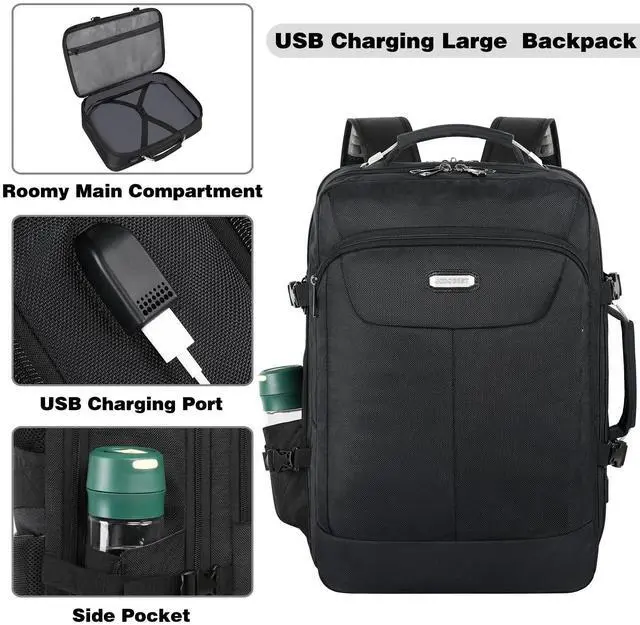 Expandable & Large Capacity: This extra large travel backpack with expandable feature offers you more packing capacity. Unzipping to get 45L storage then you can easily hold 3-7days travel gear. It fits overhead and under seat while on state of standard carry on size, is ideal for men, women, weekend traveler, or occasional vacationer. This versatile luggage backpack also meets airline carry-on requirements, for airlines such as Easy Jet, Spirit, Jet Blue. ^^ USB Charging Port & Side Pocket: Made of Water Resistant Polyester Fabric and anti-scratch material, ensure a secure & long-lasting usage. Many hidden pockets can accommodate lots of travel accessories, toiletries, side Zipper pocket for Easy access essentials, external USB port with set-in charging cable offer convenient charging your cellphone and other electronic devices. It's the best for Mother's Day, Father's Day, and also the best travel for girlfriend, wife, daughter, friends. ^^ Convertible Design & Easy to
