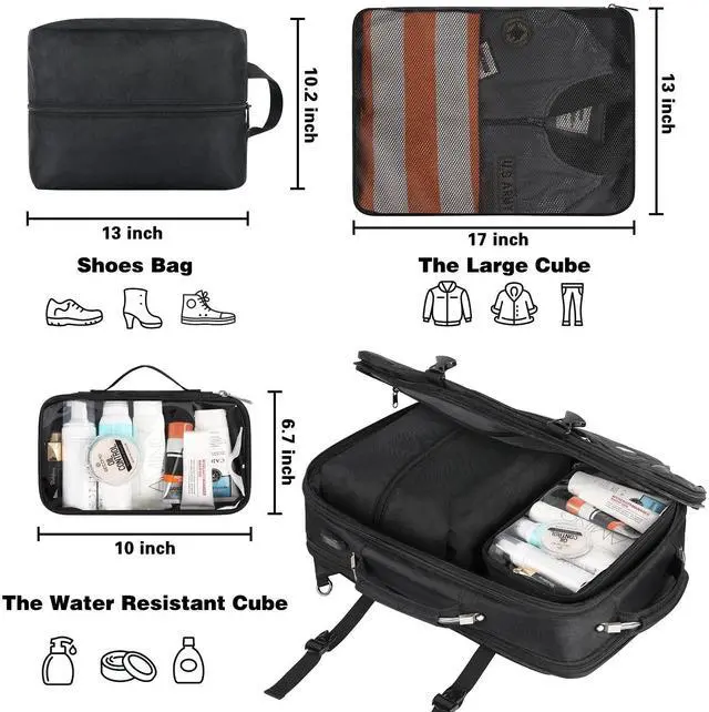 Carry: The carry on backpack is designed with hideaway padded shoulder straps which can be easily stored away in zippered back panel, transforming this vacation backpack from carry-on duffel to briefcase style and provide you a more flexible carrying experience. A luggage strap on the back is designed to fit on luggage/suitcase, for easier carry on international travel or cruise. 4 external compression straps keep contents from sloshing around. ^^ 3 Storage Bags & Easy to