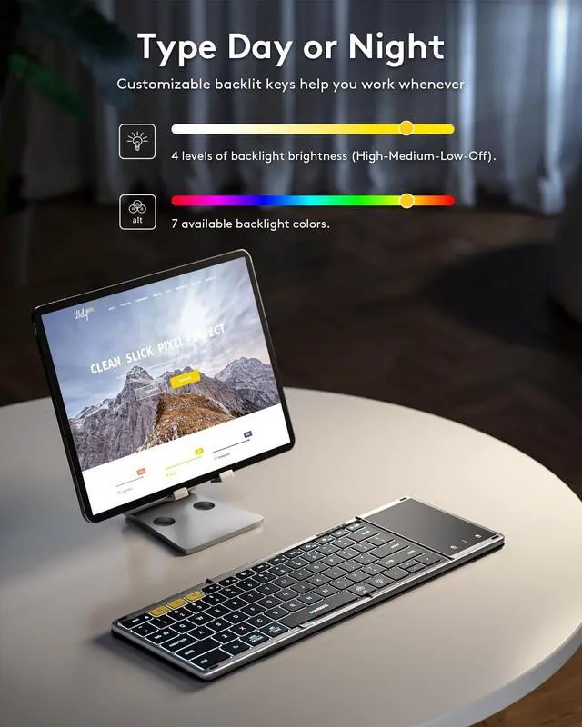 Choose from 7 colors(Green, purple, blue, yellow, white, cyan and red ) and 4 brightness levels (High-Medium-Low-Off) to match your environment and preferences, creating your focused and comfortable atmosphere! ^^ Delicate Portable KeyboardBlack PU leather appearance, made of ABS+PU material, lightweight but steady, no need to worry about daily wear or scratches. Elegant layout design, excellent tactile feel and simple appearance make it a perfect match for your tablet, phone and laptop. The Great gift for travel and business trips! ^^ Little Things & Big Convenience Samsers folding keyboard with backlight, only 11.0 ounces. Palm-sized keyboard can be folded up magnetically and put in your briefcase without taking up much space. Maximum convenience for you with minimum weight and size! Comes with a phone stand and a velvet storage bag, the perfect companion for a folding keyboard. Not just a keyboard, but a travel solution!