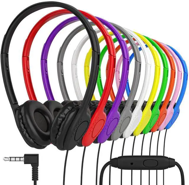 Wholesale Bundle Pack of 30 Bulk Headphones, with each headset individually packaged. Includes 10 Colors; Blue, Pink, Red, Green, Purple, Orange, Yellow, Gray, Black and White. Our design is kid-friendly and great for all ages. Suitable for airplane travel, school classrooms, library, museums, learning and standardized testing experiences for all ages. ^^ Maeline on-ear Headphones are designed for long-term comfort. Fit perfectly on your ears and provide a comfortable listening experience you can use all day. The soft leather ear cushions prevent sound leakage, reduce noise and improve the fidelity of music.