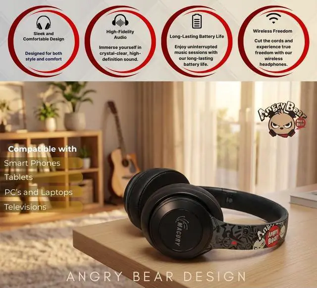 HIGH COMPATIBILITYBluetooth 5.0 technology, the "Angry Bear" BH10 wireless headphones are compatible with smartphones, tablets, PCs, and televisions at a distance of up to 10 meters. Receive calls and control your music with ease using the multi function control system located directly on your headphones. Controlling your music and calls has never been so easy! ^^ COMFORTABLEBuilt with a comfortable and adjustable headband and a pair of tight and comfortable synthetic protein ear pads, these headphones feature an ergonomic design optimized for hours of auditory pleasure just for you. This is the ideal wireless headset: whether its in bed at night listening to music or during your daily outings and activities, you can be sure that the "Angry Bear" BH10 headphones can meet your highest expectations at any time and at any place. ^^ DUAL CONNECTIONThese headphones can be used in both a wireless and wired mode, so dont worry about your headphones running out of battery, just connect your aux cable and continue to enjoy the full BH10 experience. ^^ HIFI SOUNDThe Angry Bear headphones have a high definition sound with a powerful, thumping bass system allowing you to become fully immersed in your favorite music. Escape into your own reality and live within your very own world. ^^ BATTERYThe headphones are equipped with a sturdy and long lasting 430mAh battery that allows up to 18 hours of music playing, 10 hours of phone calls, and 24 hours of LED display system, all with a single complete charge. Enjoy a full day of your favorite tunes and calls after only 2-3hrs of charge time. If the rare occasion of a dead battery occurs, always remember that you can easily and swiftly connect your aux cable in order to continue to enjoy the full "Angry Bear" experience.