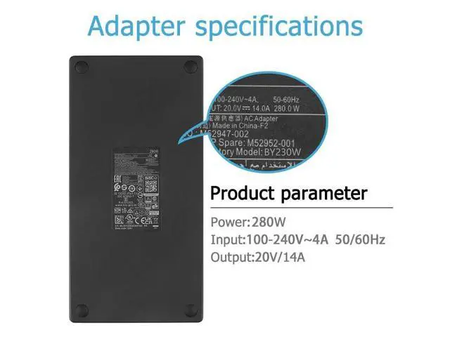 Connector Size: 7.45.0mm(as shown in the picture),Not Compatible with 4.5*3.0mm Blue tip.Input: 100-240V 50-60Hz, Output:20V 14A 280W.