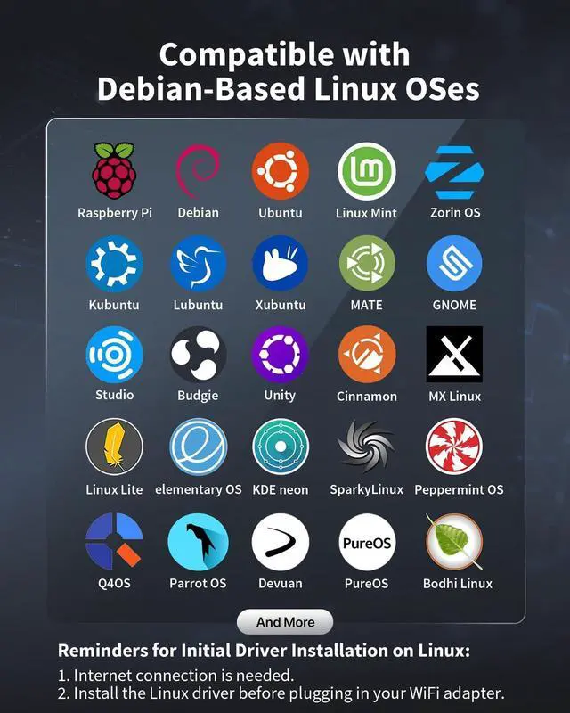 Debian-Based OSes: Supports kernels up to 6.17, Ubuntu 25.1016. 04 (all flavors), Raspberry Pi OS 138, Debian 138, Linux Mint 2218, LMDE 71, Zorin OS, MX Linux, Linux Lite, elementary OS and more. Additional supported OSes for this Linux USB WiFi adapter are listed below ^^
