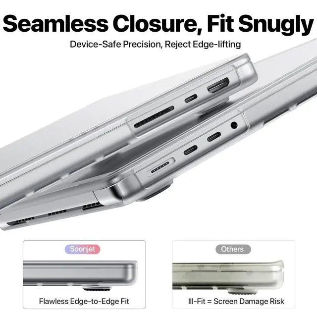 Max Chip (Models: A3434 / A3112 / A3185/ A3401 /A2992 / A2918 / A2779 / A2442). Our patented Micro-Clips lock securely and ensure a flawless fitNo gaps, edge-lifting, or screen interference. Vital for your MacBooks lifespan ^^ Bare-Device LuxuryCompatible with MacBook Pro 14 inch case, premium high-transparency matte finish, preserves your MacBook Pros original contours and sheendelivering a sleek, refined, and understated luxury experience ^^ Triple-Defense FinishMatte texture + nano anti-fingerprint layer repels scratches, fingerprints, and oil. Easily wipes clean to keep your MacBook looking pristine ^^ Slim & SleekFull-Coverage protection in an ultra-thin, lightweight build, adds minimal bulk. Precision-aligned 1:1 vents along the sides and hinge, ensure efficient heat dissipation
