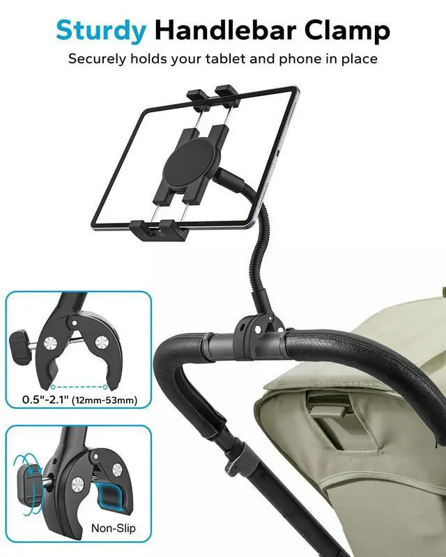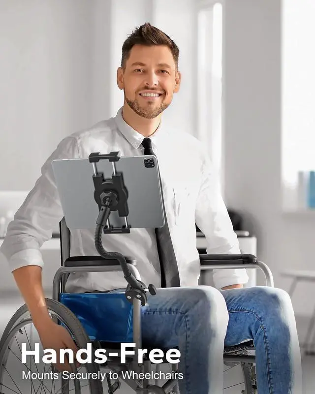 High CompatibilityWheelchair tablet holder compatible with 4.7" to 15.6" devices, including iPad Pro 13 / 12.9 / 11 / 10.5 / 9.7, iPad Air 6 / 5 / 4, iPad Mini 6 / 5, 10th Gen iPad, Galaxy Tab Ultra, Surface, Fire HD, and all major large tablets and smartphoneseven with protective cases