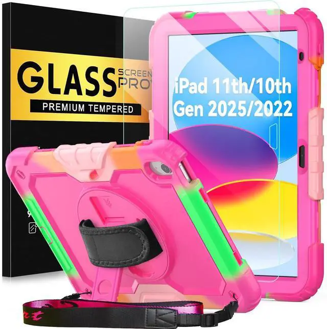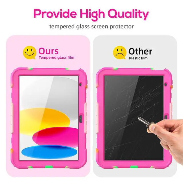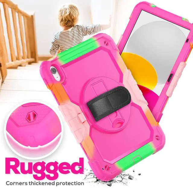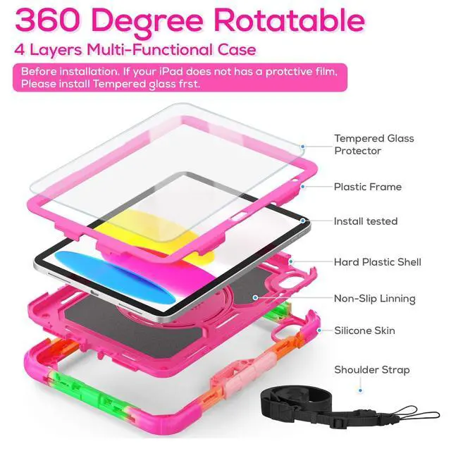 Hand Strap: Rotatable kickstand allows multi-angle viewing, pretty easy for movie watching and kids boys girls toddlers learning on the go. Soft rotating handle strap prevents falling of iPad 9th generation, featuring convenient use for teachers, students, waiters, doctors, nurses and conference presenters ^^ The removable shoulder strap lets you attach it to any of the two corner holes of the iPad 10th generation case, making it easy to sling over your shoulder on your commute. Perfect for hiking trips where you can quickly grab iPad to snap a photo. Its portable design is perfect for kids on walks and trips, and for students at school.