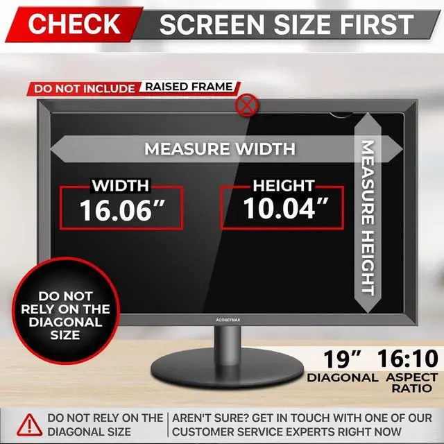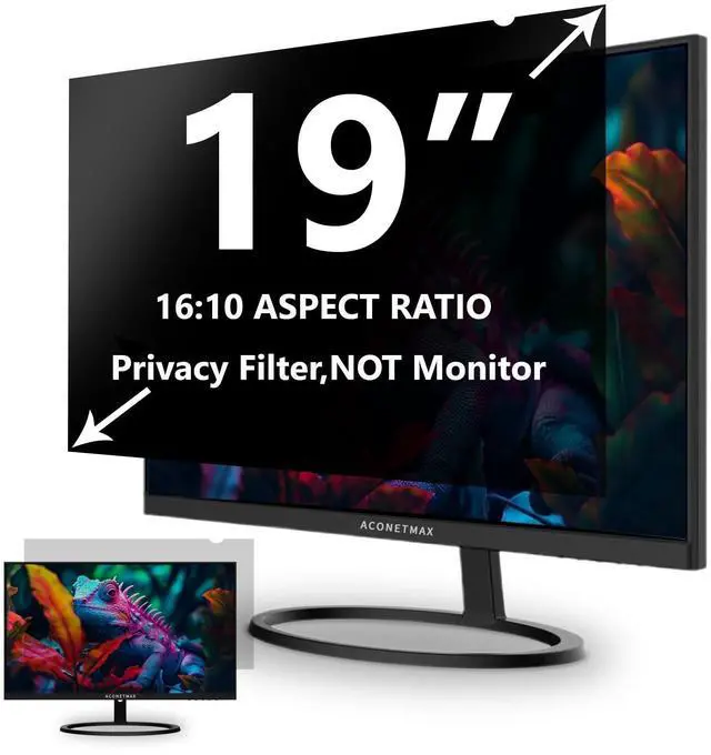 Filter Dimentions- Width: 16 1/16" (408 mm), Height: 10 1/16" (255 mm), Diagonal: 19" ( 482.6 mm) Aspect Ratio 16:10 - ACONETMAX 19 Inch Monitor Privacy Screen Filter is engineered to be compatible with HP, Dell, Samsung, Lenovo, LG, Acer, ASUS, ViewSonic, and other monitor brands. Please verify your computer screen's width and height measurements before ordering. It's not recommended to make your selection based solely on your computer screen's diagonal size. ^^ Superior Privacy19 Inches computer privacy filters are designed with advanced microlouver technology to block visibility at around 30 degrees, and black out screens completely near 60 degrees. the 19 inch privacy screen keeps your electronic information confidential, making it excellent for use in high traffic areas. ^^ Anti Glare & Blue LightThis blackout privacy screen filtering out 99.9 % UV and curbing blue light by 98% to reduce eye strain and minimize the potentially harmful effects on your eyesight. As a reversible privacy screen filter 19 inch: choose the glossy side for an extra clarity and enhanced privacy or choose the matte side to minimize glare and distracting reflection. Meet your different daily use needs. ^^ Two Attachment Options- The Monitor Privacy Screen Filter Installs Easily. Option 1 uses clear adhesive strips that securely attach to any computer screen. Option 2 (for computer screens with a raised bezel only) uses slide mount tabs that easily stick to the display frame, allowing you to slide the privacy screen filter on and off as needed. ^^ Package Contents- Each package includes one 19 inch privacy screen filter [One Side Matte and One Side Glossy], two sets of clear adhesive strips, two sets of slide mount tabs, and a microfiber cleaning cloth. Buy with confidence ACONETMAX specializes in providing best-in-class privacy solutions to individuals, small businesses, corporations, government, and educational institutions. ^^ Lifetime Support ACONNETMAX computer privacy screen filters are protected under lifetime policy and if anything happens we will send you a new privacy screen at absolutely no cost. So please don't hesitate to place an order, giving your computer screen 19 inch best privacy and protection while working in travel or open workspaces.