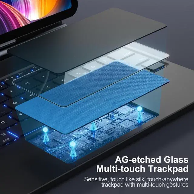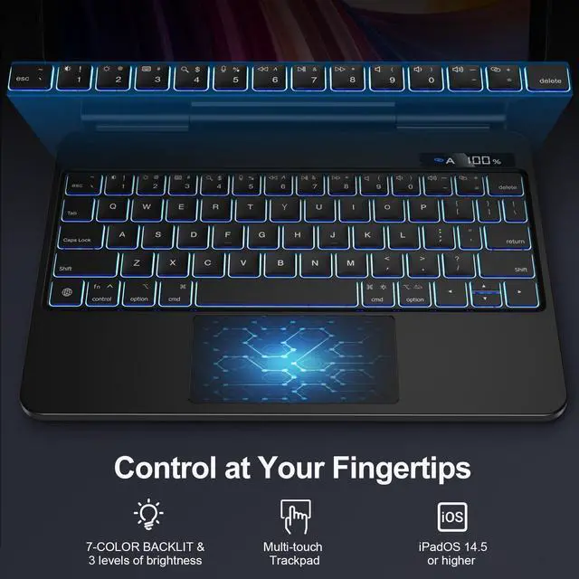 Multi-Touch Trackpad: with a built-in precision trackpad that can quickly and easily navigate your iPad. Full multi-touch gesture support you redefine productivity by allowing you to edit documents, build presentations, and browse the web with unparalleled speed. It also with a full row of iPadOS shortcuts, to adjust brightness levels, volume or change your music with one tap. ^^ 7-COLOR BACKLIT & 3-levels of Brightness for Easy Work at