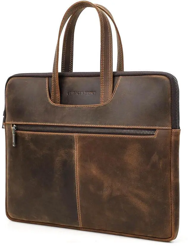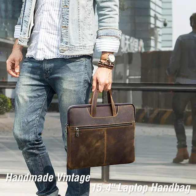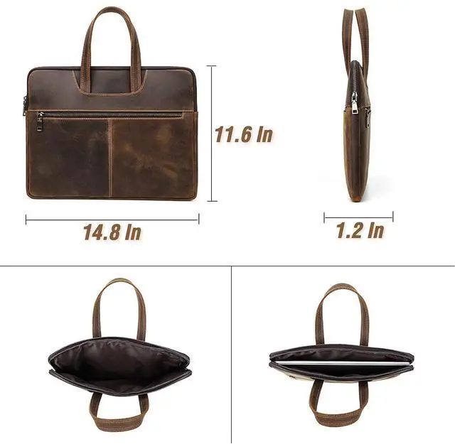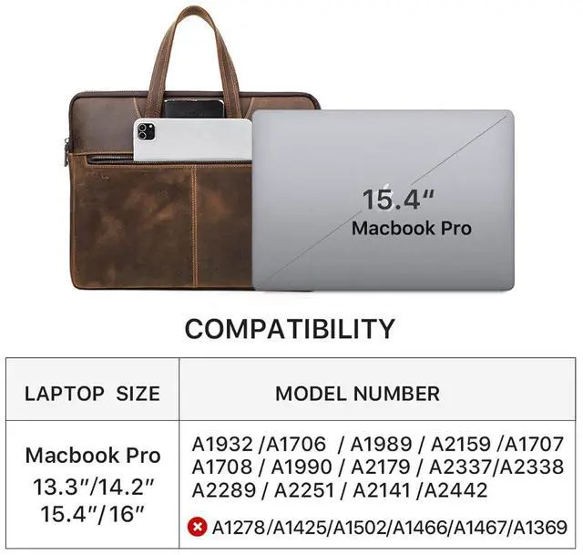 Elegant Top Grain Leather Our Laptop Hand Bags are crafted from premium top grain leather, known as Chamois Leather, this craft boasts a smooth texture and a refined appearance. Resistant to scratches, it ages beautifully, enhancing its elegance over time! ^^ Vintage Design, Modern Utility This handmade craft combines a minimalist vintage design with practicality. Sized at 14.8" x 11.6" x 1.2", it's perfect for compatible with MacBook Pro/Air 13.3" / 14.2" / 15.4" /16" & other Laptop/Tablet. Offering protection without sacrificing portability! ^^ Genuine Quality, Lasting Durability Our top grain leather showcases natural characteristics, setting it apart from artificial materials like split grain or PU.