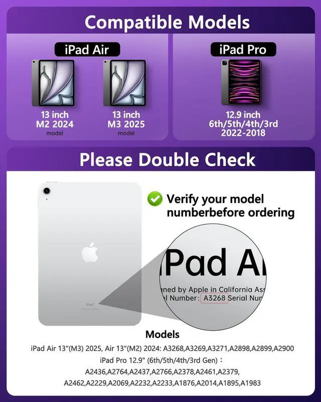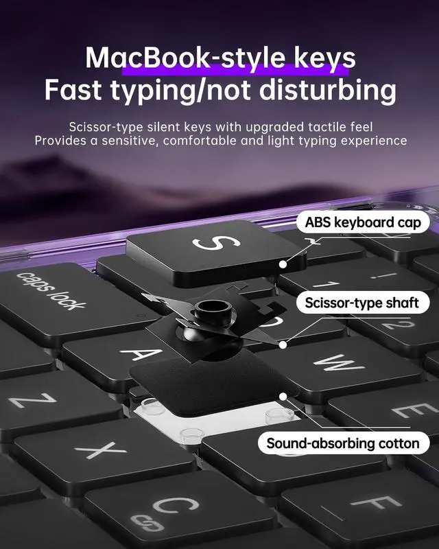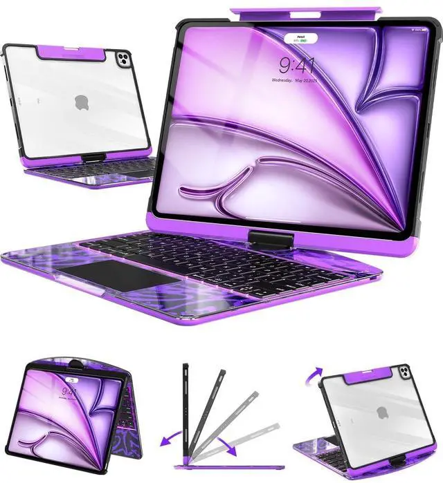 Transparent Design & CompatibilityDesigned for iPad Air 13 inch (M3/M2 2025/2024) and iPad Pro 12.9 inch (2022/2021/2020/2018); models A2898 A2899A2900A3268A3269A3271A2436A2437A2764A2766A2378A2461A2379A2462A2229A2069A2232A2233A1876A2014A1895A1983, this sleek transparent case with keyboard offers a perfect fit while showcasing your iPads original beauty. ^^ 7-Color Backlit & Wireless KeyboardTransparent ipad air 13 inch case keyboard Type in any light condition! The vibrant 7-color backlit ipad keyboard case allows you to choose your style or work in the dark. The wireless connection ensures a seamless and stable typing experience without any complicated pairing processes. ^^ Built-in Precision Touchpad & 360 RotationBoost your productivity with the multi-touch trackpad that supports intuitive gestures (like swipe and pinch-to-zoom).