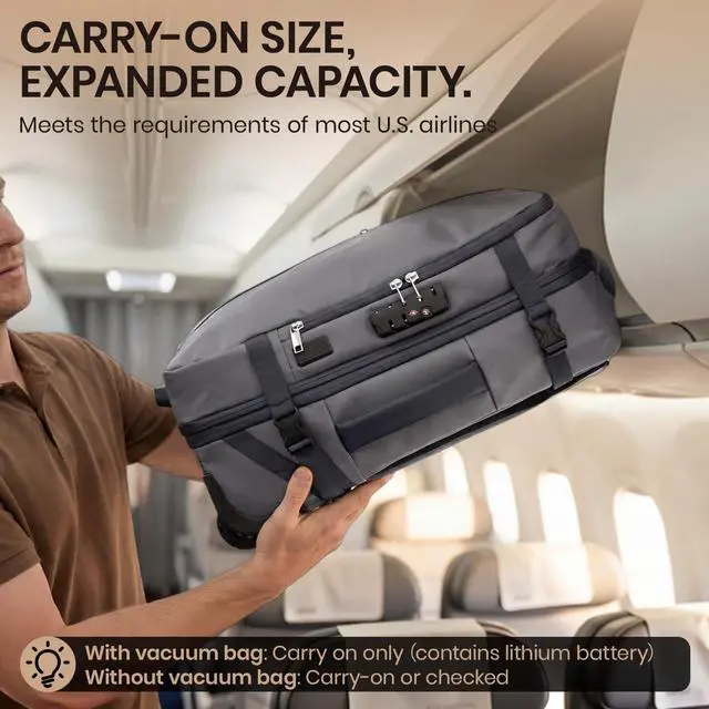 More Practical Features: This vacuum backpack travel with pump incorporates 7 versatile pockets to streamline your packing. These include a dedicated vacuum compression bag for clothing, a wet/dry separation pouch for damp items, a padded laptop compartment, a side water bottle pocket, and three organizer pockets for small essentials. The expandable design allows the capacity to be increased. Ample storage that complies with airline carry-on standards, balancing space and convenience