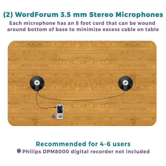 Equipped with a 3.5 mm TRS stereo plug compatible with any recording device that has a 3.5 mm TRS stereo powered jack (Not compatible with 3.5 mm TRRS 4 Pole jacks unless you have an adapter. ) ^^ Capable of recording multiple people speaking at once for meetings, teleconferencing, video conferencing, Zoom, SKYPE, VoIP (Voiceover Internet Protocol) Calls ^^ Connect additional microphones in series for cascading (daisy chain) option in multi-user applications ^^ Features wide frequency response for clarity and enhanced intelligibility with 360 degree boundary microphone with omnidirectional digital recording ^^ Includes (2) WordForum 3.5 mm TRS stereo conference microphones with 8 foot cord in zippered carrying cases