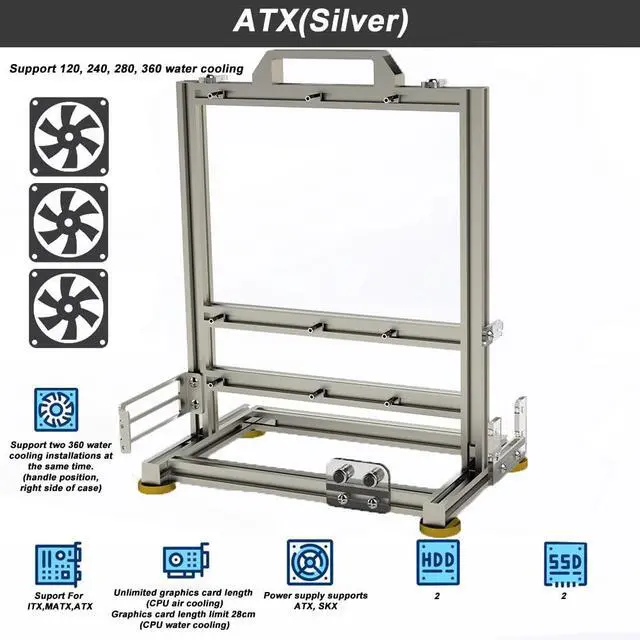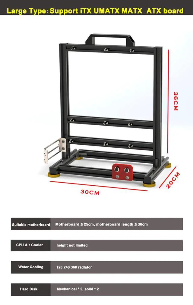 38*35*4cmNote: 1. It's only a open case, not include other products. The computer case frame needs to be installed by yourself. 2. There might be a little error of the size for manual measurement. 3. The color deviation might differ due to different monitor settings, please kindly understand. 4. The PC case frame supports horizontal installation of graphics cards by default. If need to install graphics cards vertically, you need to purchase additional extension cablesPackage