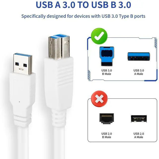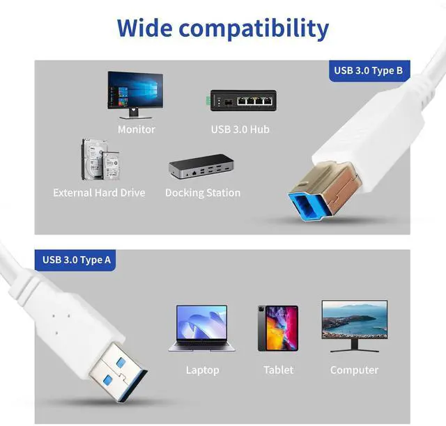 UNIVERSAL COMPATIBILITY: Sturdy USB type a to b cable is compatible with some devices that with USB 3.0 type B port, such as Fujitsu ScanSnap iX500 scanner, monitor, USB 3.0 docking station, USB 3.0 hub, scanner, and most of USB 3.0 external hard drives with Type-B USB 3.0 port.