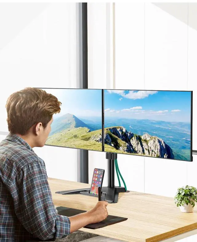 The groove of the base can put the mobile phone, free your hands, and increase comfort. ^^ Clutter-free Desktop - Raise your monitor to a demand height, freeing up your workstation. It comes with clips for tidy cable management and helps keep your power and AV cables clean and organized. ^^ Effortless Assembly- Work is already hard enough! We don't want to make things harder. And that's why this monitor stand comes with labeled parts and clear instructions for quick assembly. When installing monitors, please hang 2 monitors onto the arm at the same time to avoid the danger of tipping, and please keep the two arms in balance during use.