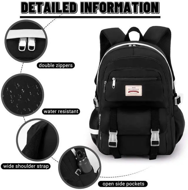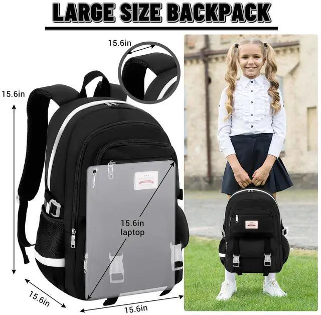 Large Size School Backpack-The size of backpack is 12.2" x 5.9" x 17.8" (L*W*H), It includes 1 padded laptop pocket for a 15-inch laptop. The backpack weighs approximately 1.54 lbs. The front of the school backpack is designed with double buckles, making the bag more fashionable and unique and convenient. ^^ Waterproof &Smooth Zipper-The campus backpack is made of waterproof, ultra-lightweight, high density nylon fabric and cute printing polyester lining. The metal zippers closure are used by the premium quality zippers to ensure the long-lasting usage. ^^ Multi-compartments & Large Capacity -Interior - The main compartment includes 1 zippered pocket and 1 laptop compartment.