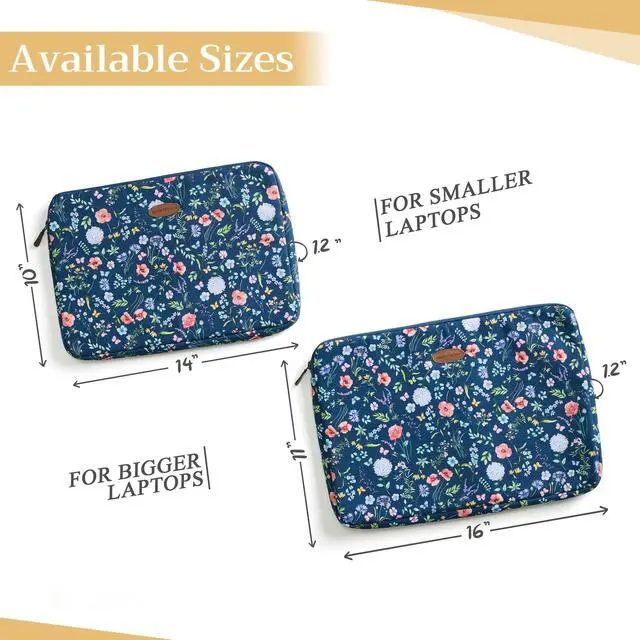 Artsy Designs and Vibrant patterns in vibrant colors provide huge visual interest, setting our bags apart. It is a versatile choice for just daily use, travel or commuting and a true delight to carry around. ^^ Comes in two sizes o Small 14 Width, 10 Length, 1.2 Deep (Outer dimension) Compatible with 12- 13.3 Laptops / Ultrabooks, 13- 13.5 Laptops / Notebooks / Ultabooks. o Large 16 Width, 11 Length, 1.2 Deep (Outer dimension) Compatible with 15 Macbook air / Macbook pro, 15.3 ipad pro and most 14- 14.56 Laptops / Notebooks / Ultrabooks.