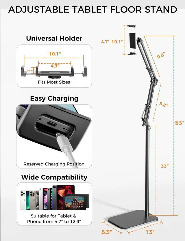 Wide CompatibilityThis tablet floor stand is compatible with all phones and tablets ranging from 4.7 to 13 inches, such as iPad, iPad mini, iPad Air, iPad Pro 12.9", Galaxy Tab A 10.5, 10.1, 9.7, 8, Galaxy Tab S 8, 9.7, Galaxy Tab E 9.6, Kindle, Surface Pro, Nintendo Switch, and more. It also supports smartphones like iPhone 6, 6 Plus, 7, 7 Plus, 8, 8 Plus, X, XR, XS, XS Max, iPhone 11, 12, 13, 14, and 15 series, among others.