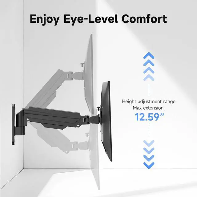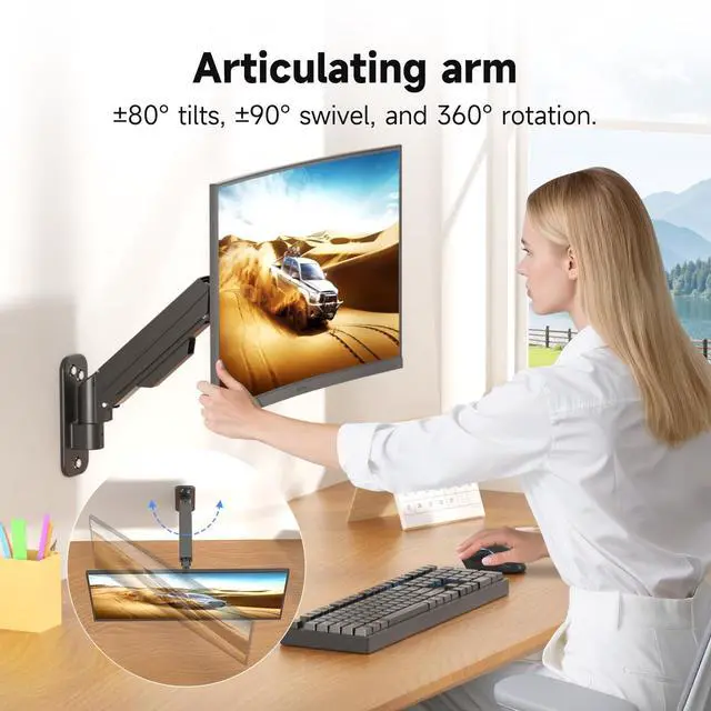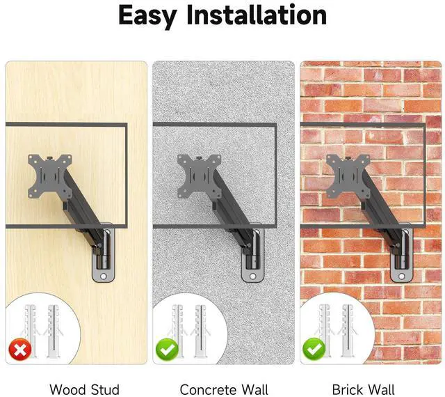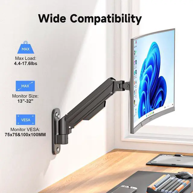 Wide Compatibility - This Single Monitor Wall Mount Fits 13 to 32 Inch computer Screens with VESA pattern 75x75mm and 100x100mm, supports 4.4 - 17.6 lbs monitors. ^^ Full motion-The gas spring provides a smooth adjustment motion. Easy height adjustment, rotate 360, tilt +10to -10 up and down, swivel 180 left and right. ^^