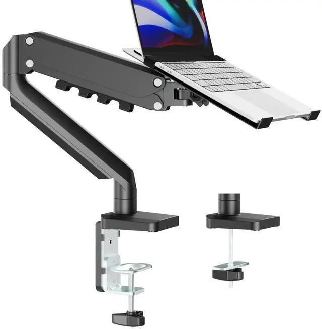 Adjustable Laptop Arm: Thanks to the built-in premium gas spring mechanism, our laptop desk mount can be extended forward up to 19.7" and elevated to a maximum height of 16.34", making it a great addition to your standing/sitting desk setup. The laptop arm mount is versatile for 45 tilting up and down, 180 swiveling and 360 rotating, providing you a more flexible, comfortable viewing angle and helping relieve strain on your spine, neck, and shoulders ^^