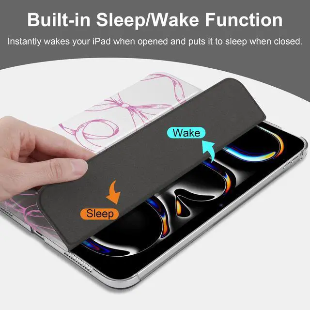 • Magnetic protective cover automatically wakes iPad when open and hibernates when closed to conserve power. Tri-fold stand provides the perfect viewing and typing angle