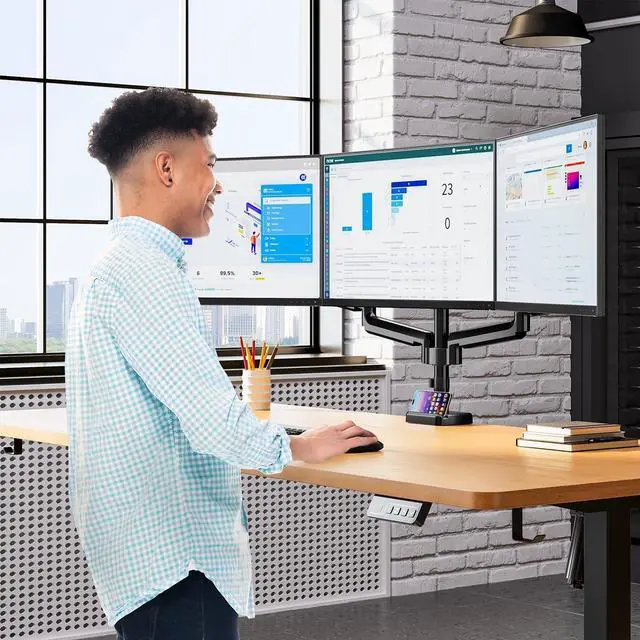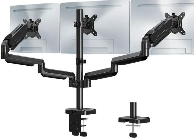 Optimize Your View - Our fully adjustable triple monitor arm offers a wide range of movement. Supports screen rotates 360 for landscape or portrait orientation, swivels 180 to share your display, and tilts up 90/down 90 for better viewing. Plus, the 2 gas spring arms can easily extend, retract, and adjust the height dynamically. With multiple screen combinations, you can easily find the optimal viewing angle and position for comfortable work. ^^ Fits Your Needs - Our upgraded 3 monitor stands for 3 monitors, and widely fits most 13" to 32" flat/curved computer screens, including but not limited to 17 18 19 20 21 22 23 24 25 26 27 28 29 30 31 32inch PC monitor.
