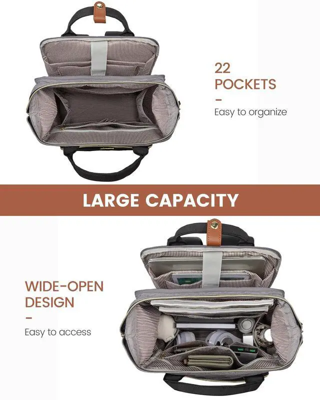 • WIDE OPEN LAPTOP BACKPACK: Featuring a large steel-frame rectangular opening, this laptop backpack for women allows you to easily view and access your items. Made from high-tenacity nylon, it is tear-resistant and waterproof, ensuring durability. The leather accents on the handles and zippers add a touch of sophistication. Contrast color design on the outside and striped lining on the inside make the womens backpack practical and stylish.