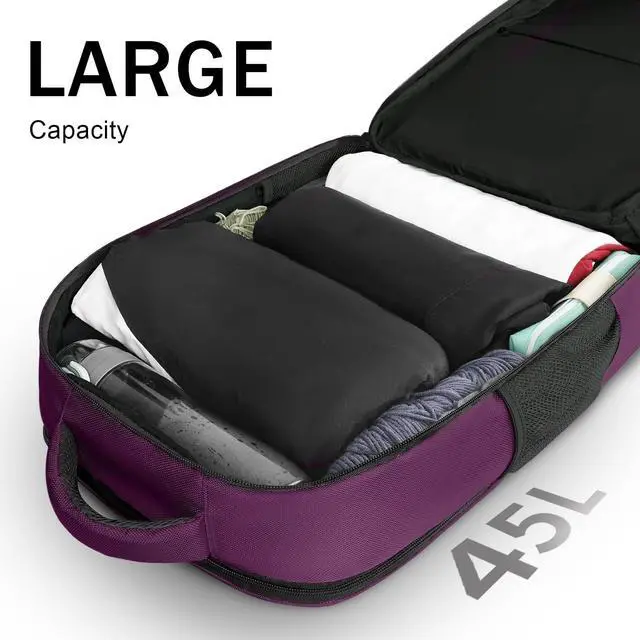 Spacious & Organized: Everything in its place! This large 45L travel laptop backpack stay organized with 4 main compartments, the backpack luggage's main compartment with double zippers has enough storage room to store like a suitcase, fits up to 3-4 days trip. The separate laptop compartment offers enhanced padding to protect your 18" laptop. The front compartment has many pockets to keep your belongings organized. The Secure hidden pocket design can protect your passport, wallet & valuables ^^