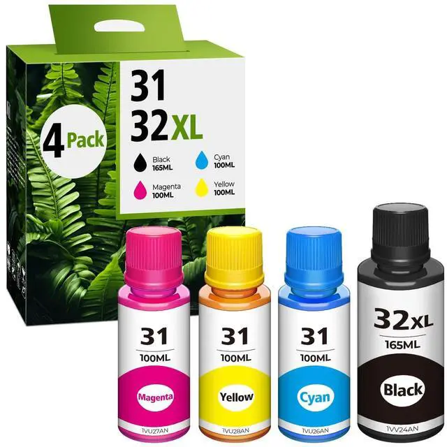 Larger Capacity: compatible for HP 31 32XL ink combo pack ( compatible for hp 32 XL * 1 black, compatible for hp 31 * 1 cyan, 1 magenta, 1 yellow). compatible for hp 32xl black ink bottle 165ml, compatible for hp 32xl color ink bottle 100ml, Page