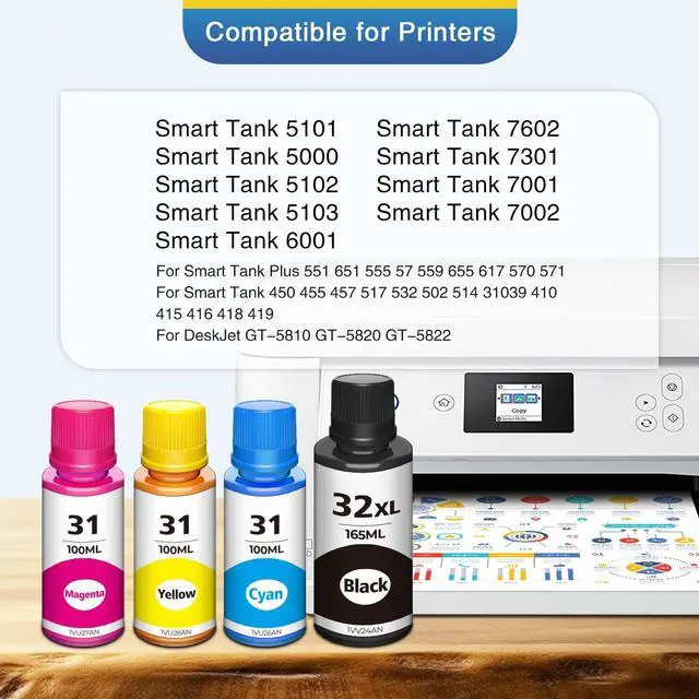 HP Ink 31 32XL: Topcolor ink compatible for hp 31 for hp 32xl ink, compatible for hp smart tank ink printers, compatible for hp smart tank 5101, smart tank 6001, smart tank 5000, smart tank 7602, smart tank 7301, smart tank 7001, smart tank 5102, smart tank 7002, smart tank 5103, compatible for hp Smart Tank Plus 651 551 555 557 559 655 617 570 571, compatible for hp smart tank 450 455 457 517 532 502 514 310 319 410 415 416 418 419, compatible for hp deskJet GT-5810 GT-5820 GT-5822 printers. ^^ Compatible for HP 31 32XL