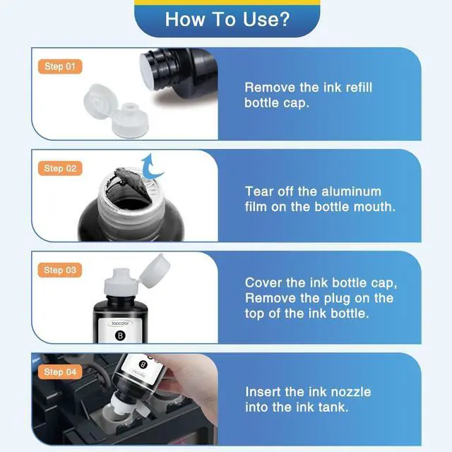 Yield: 9, 000 pages per 32XL black ink bottle refill, 8, 000 pages per 31 color ink bottle refill. ^^ Compatible for HP 31 32XL ink refill