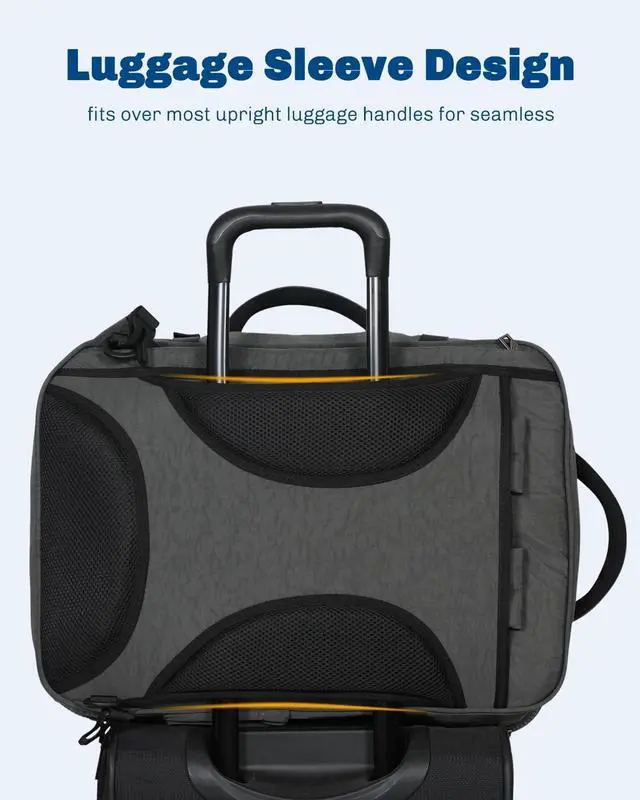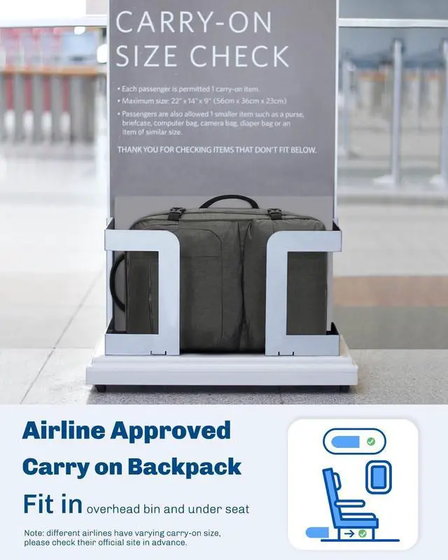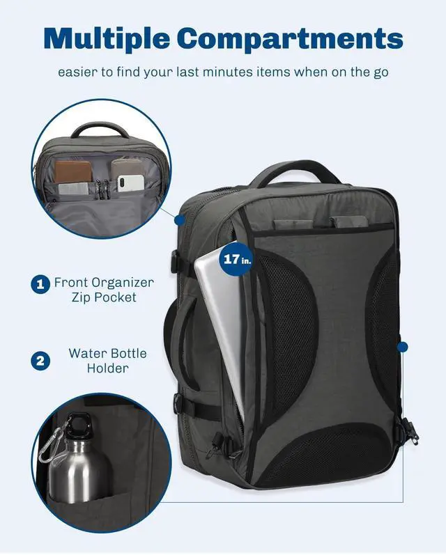 Description"Quicker Access Your Itembackpack carry on luggage designed with 2 front zip pockets store any last minutes items, middle compartment features with inner organizer pockets for travel must haves, from passport to power bank; 1 side holder keeps your bottle or umbrella; roomy main compartment features interior 4 pockets to organize you belongings, from shirts to pants Fits up to 17 inchcomputer backpack features with back padded laptop compartment fits for a 13 inch, 14 inch, 15 inch, 16 inch or 17 inch, mens backpack for travel keeps your device from knocks and bumps, also easy access whenever in the waiting hall or on the flight; laptop travel backpack compartment dimension: 52 x 35 cm / 20.5 x 13.8 inch; we recommend to store slim laptop Comfy to Carryhide-away contoured traveling backpack straps are well padded with air mesh, carry it as a carry on backpack or easy convert into a travel duffel bag in a second; 4 carrying options for travelers' multiple alternatives; 1 sternum strap that adjusts lengthwise and slides up and down the shoulder straps, and 1 adjustable waist strap designs for stabilization and carry comfort Flight Approved Sizebusines travel backpack for women made of water repellent 420D nylon and 230D polyester lining, airport carry on backpack which can fit in the allowed maximum size of most IATA flights and also fit in the overhead compartment, 44L carry on backpack for airplanes Approx.