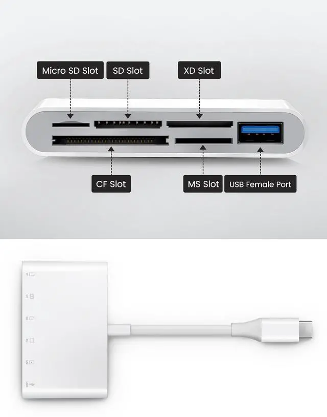 USB C to USB OTG Adapter Supports SD, Micro SD, XD-Picture, MS or Memory Stick multiple types of memory cards, but also compatible with all kind of cameras, flash drives, keyboard, mice, hard disk ,etc. Great convenience for you to transfer files between different devices.