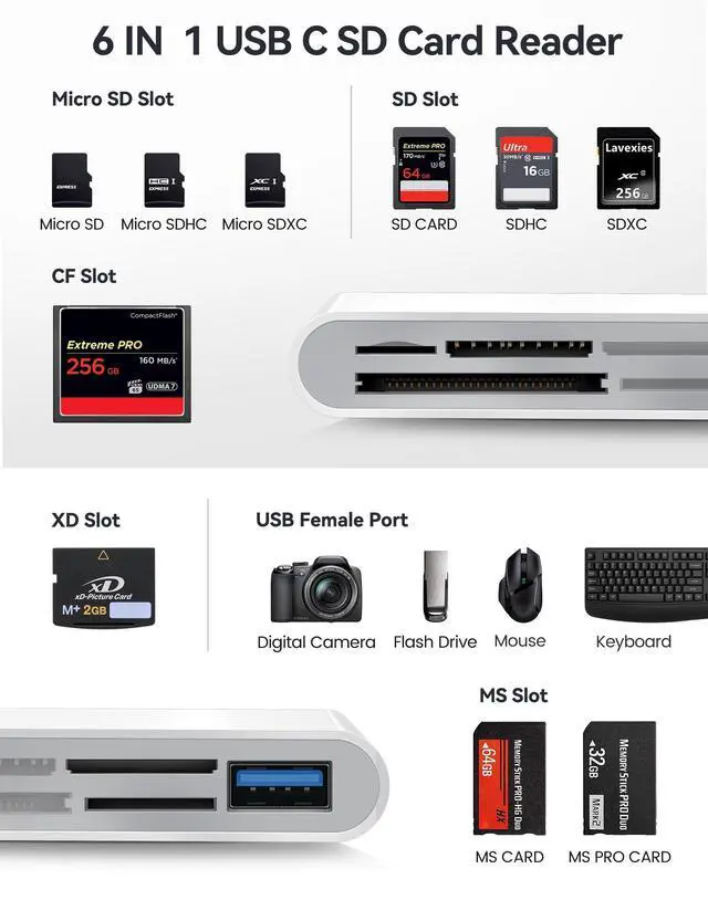 USB-C SD Card Reader This USB-C SD card Adapter supports SD,Micro SD, CompactFlash, XD-Picture, MS or Memory Stick multiple types of memory cards, let you to easily browse and copy photos and videos from your cameras, and quickly share your beautiful moments.