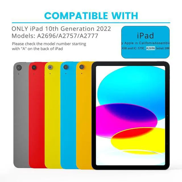 Compatibility This magic keyboard case is only compatible with ipad 10th generation 10.9 inch 2022 10th Gen model A2696, A2757, A2777 ^^ 7 Colors Backlight & 3 Modes Adjust BacklitThe keyboard for ipad 10th generation with multi-touch trackpad and 7-color backlit provide a comfortable and efficient typing experience. With 3 adjustable brightness levels, making typing smooth and efficient, protect your eyesight. ^^ Long Lasting Battery The battery for ipad 10th generation case is ultra-efficient design let you work longer on a single charge. The keyboard charges the battery very quickly via USB-C.
