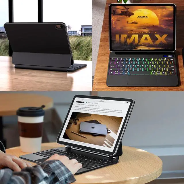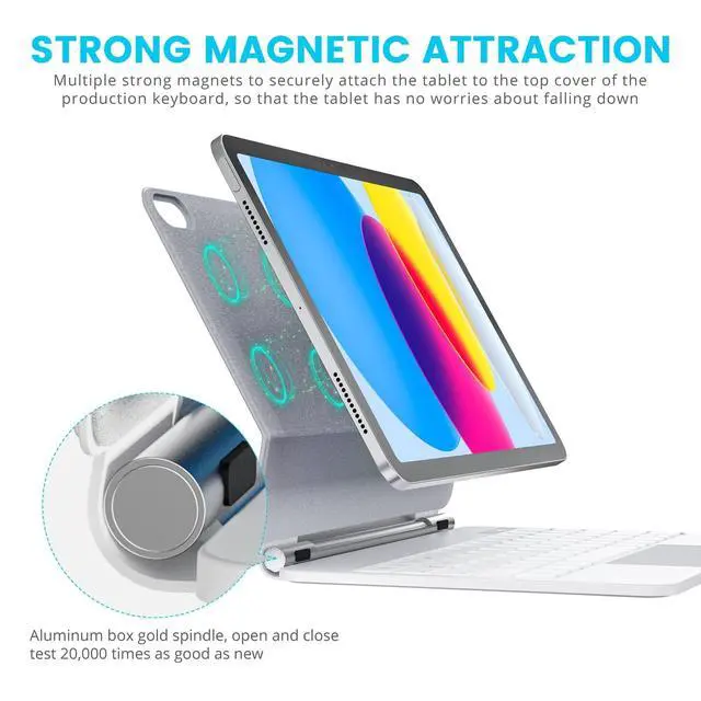 With LED display that shows remaining battery percentage. ^^ 135Adjustable Floating Magnetic StandAngle adjustable up to 135 degrees, whether you are in the office, school, or cafe, Set the floating cantilever stand find your perfect viewing angle, and transform your iPad into a highly performant and easy-to-use laptop within a second. Which is perfect for traveling, business, and school. ^^ Smart ProtectionThe keyboard case is composed of a sturdy magic keyboard base and synthetic vegan leather case which offers unmatched protection to the iPad 10th gen during use, on the go or in case of accidental knocks/falls.