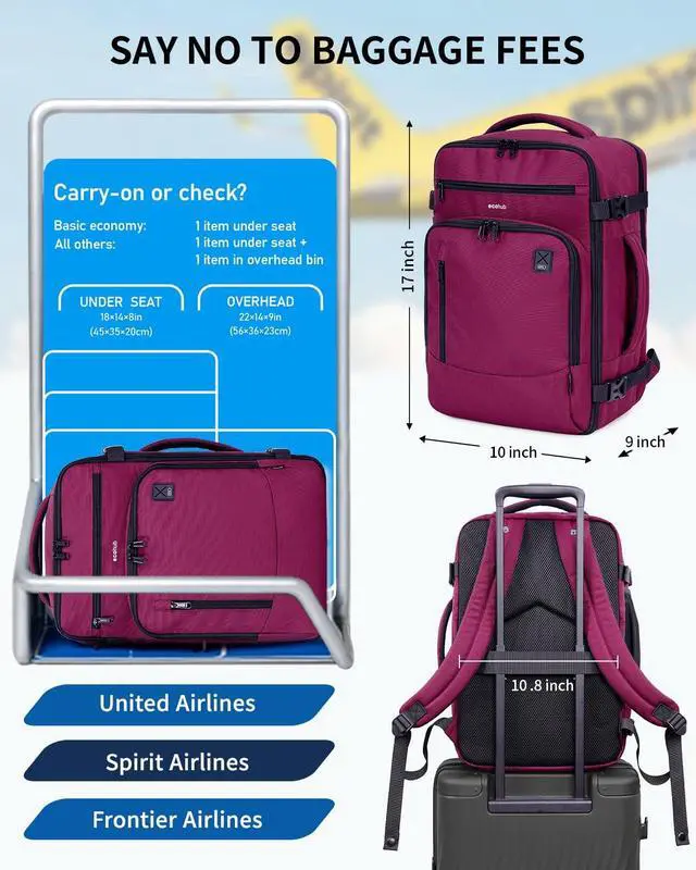 SAY NO TO BAGGAGE FEES: The ECOHUB 25L Carry On Bag is perfectly sized to meet United Airlines' personal item requirements. Measuring 17" x 10" x 9" and weighing just 1.6 lbs, it fits neatly under the seat. Its also compatible with Spirit, Frontier, EasyJet and many other airlines. (Patent Pending) ^^