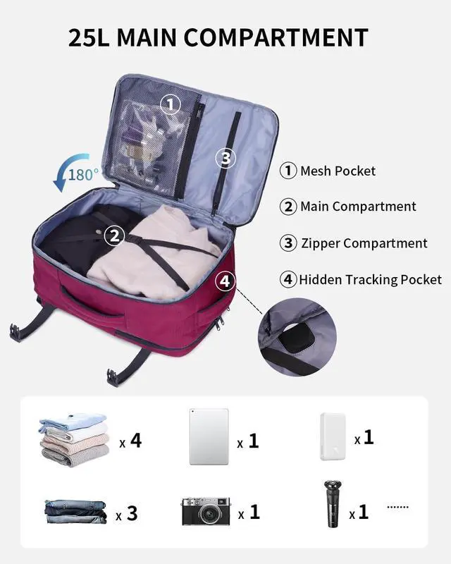 • DESIGNED FOR TRAVEL: This carry on backpack features a 180 opening for easy packing. The main compartment includes two pockets to keep toiletries and socks organized, with elastic straps to secure your essentials. A dedicated AirTag pocket helps you track your bag easily. Side compression straps compact the bag, while the side handle and trolley sleeve provide multiple carrying options for added convenience.