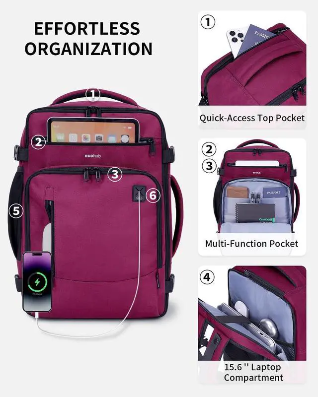 ECOHUB 17" Small Travel Backpack, United Airlines Personal Item Bag 17x10x9 with 16 Pockets, Water Resistant Rucksacks Fit 15.6" Laptop, AirTag Pocket, Lightweight Casual Daypack, 25L, Red