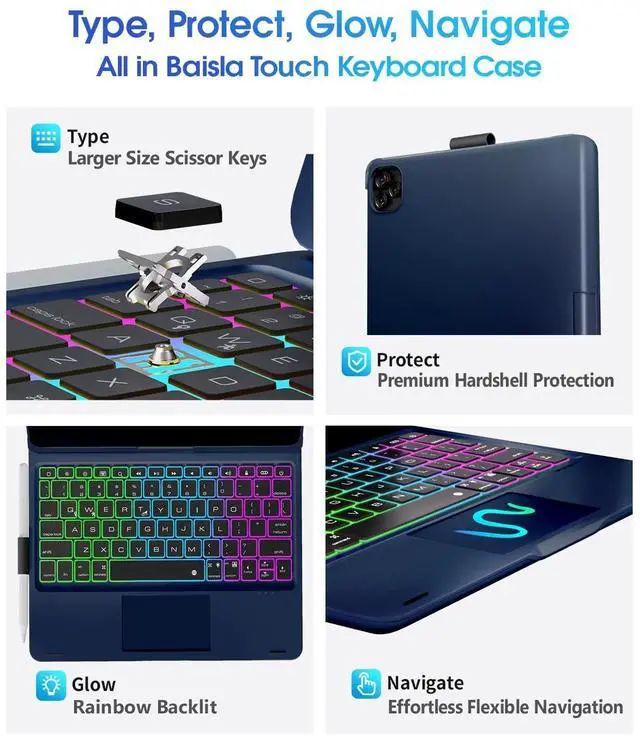Whether youre a professional, a writer, or frequent traveler, our iPad 11 inch case with keyboard is designed to meet your needs ^^ Rainbow Backlit - Illuminate your workflow with vibrant rainbow backlight, iPad 11th generation case with keyboard features 3 adjustable brightness levels. You can customize brightness and backlight color to suit your preferences and habits. Enjoy a sleek and stylish setup with Baisla ipad Keyboard 11th generation 11 inch with pencil holder ^^ Full Protection & Smart Power Saving - iPad Pro 11 inch case with keyboard provides superior protection with premium hardshell design, ensuring all-around defense against drops, scratches, and dust.