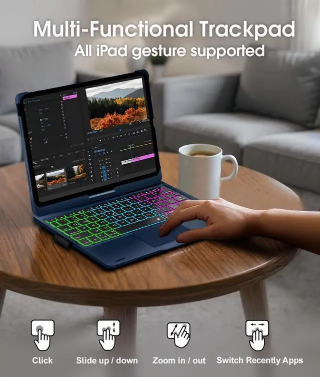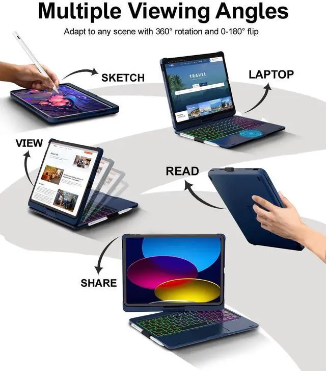 Enjoy browsing, designing, or drafting with unparalleled convenience. Easily lock the trackpad while typing by pressing fn+T key to avoid accidental touches, and press again to unlock ^^ Large Battery Capacity - With a built-in 500mAh large battery and efficient chip, our iPad 10th generation case with keyboard delivers 3x faster connection - giving you amazing iPad experience! Quickly recharge with the included Type-C charging cable, achieving a full charge in just 3 hours ^^ Multiple Viewing Angles - iPad Air 11 inch case with keyboard supports 360 rotation and 0-180 flip, effortlessly adjusting to the most comfortable viewing angle.