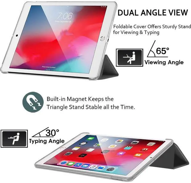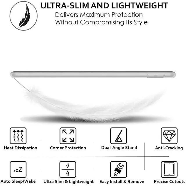 [Smart Auto Sleep/Wake Function] - This case supports Automatic Sleep/Wake feature when the lid is opened and closed. ^^ [TriFold Stand Feature] - The Tri-Fold front provides you two standing positions for viewing or typing need. ^^ [Full Protection] - Anti-Scratch PU leather front with PC back cover are lightweight and durable to protect your device from scratches and shocks. ^^ [Precise cutouts & 100% Fit] - Precise cutout and design allow easy access to all ports, sensors, speakers, camera port.