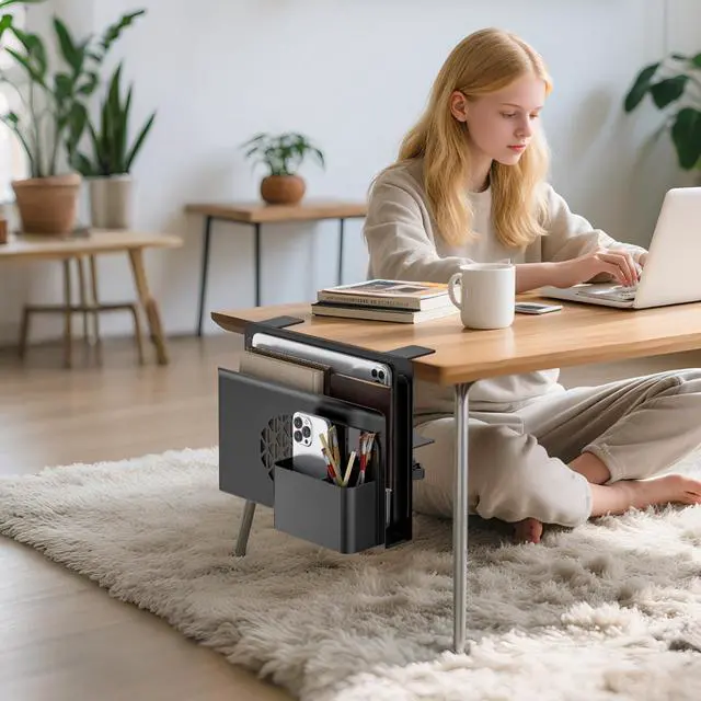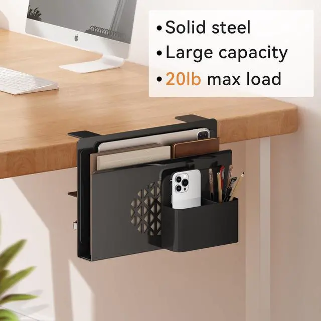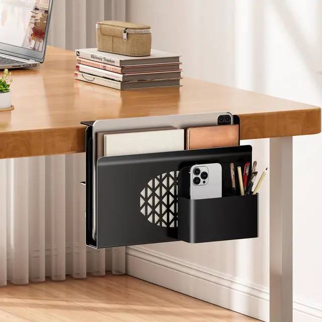 Maximize your workspace with this clamp-on Desk Side Storage. Made of heavy-duty metal, it features a magnetic pen holder and vertical laptop slot. Fits most flat desks ( 0.5" 3.5" ) with pre-installed silicone pads to protect surfacesno drilling required.