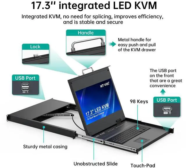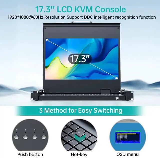 OSD menu: Screen OSD and KVM OSD, also supports external USB mouse. ^^ Come with Handle & Lock. [All-IN-ONE Design] You just need to place the KVM directly into 1U rackmount and tighten the screws. This KVM console is upgraded with alumium for less wight, and the draw shell is made by steel for sturdy. ^^ Compatible with Dos/Windows, Linux, Unix, Mac OS 8.6 /9/10. Includes 8packs 2in1 kvm cables. To order longer cable, please search