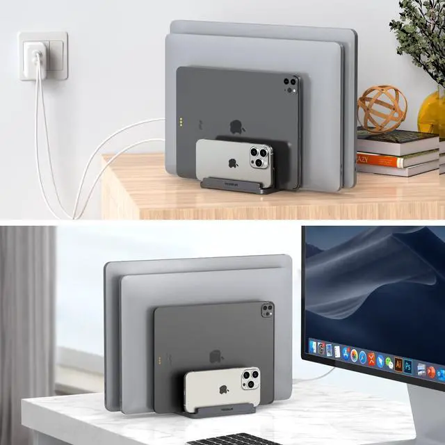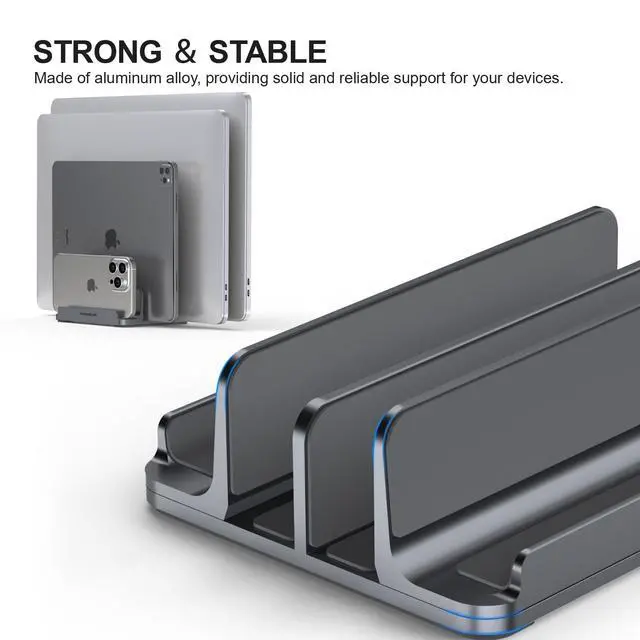 Quadruple-Slot Design: Vertical stand features 4 slots, allowing you to store both a laptop and a tablet and a phone simultaneously, making it a space-saving solution for your desk.