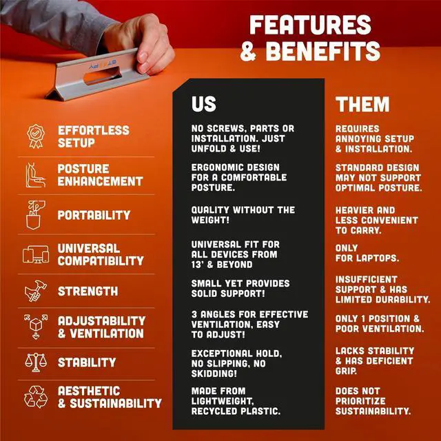 Feather-light, eco-friendly plastic lets you take quality comfort anywhere! ^^ FITS ALL YOUR TECH - The macbook stand for desk is compatible with all devices such as iPad wedge or iPad writing stand, iPhones, Laptops, Air, Pro, HP, Dell, Lenovo, Smartphones, Tablets, Samsung Galaxy, Androids, Kindle, Fire & video projectors. ^^ POSTURE PERFECTION - If you spend countless hours seated working at the office or home, a bad posture could be the cause for a serious back problem. Reduce the back strain with this macbook stand for writing, you'll get the ideal working posture to get the most out of your working hours without any backlash.