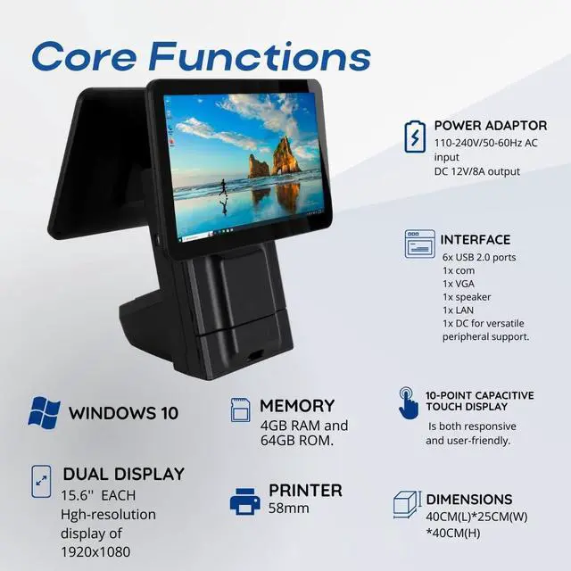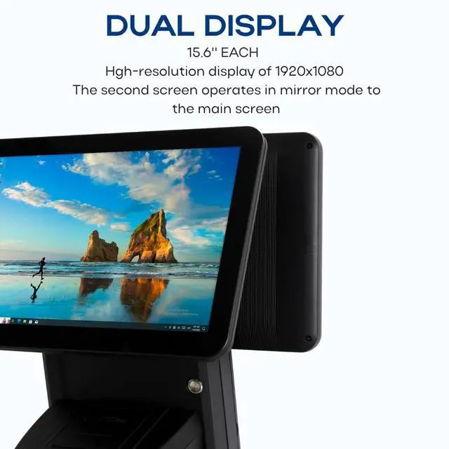 Intel i3 processor: The M9W POS offers a complete and robust solution for your business, combining the Windows 10 operating system with a powerful Intel i3 processor for exceptional performance in managing sales, inventory, customers, and more. Ideal for retail stores, restaurants, bars, and any business requiring a reliable and efficient point-of-sale system. ^^ Dual 15.6 -inch Full HD touchscreens for a superior user experience: Maximize efficiency and customer interaction with the two 15.6 -inch Full HD touchscreens (1920x1080). One screen for the operator and another for the customer, allowing you to display relevant information, promotions, or advertising dynamically and attractively. The 10-point capacitive touch technology ensures precise and fluid response. The second screen operates in mirror mode to the main screen. ^^ Smooth performance and efficient multitasking with 4GB of