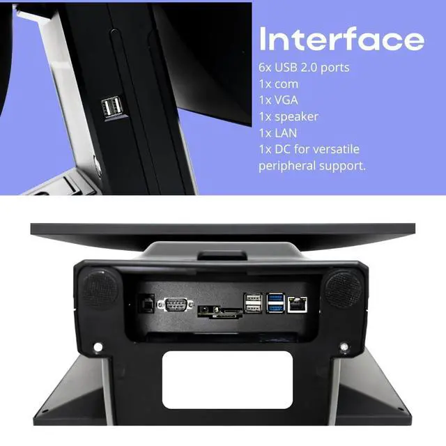 Full HD (1920x1080) resolution: Enjoy sharp and detailed images on both screens thanks to the Full HD (1920x1080) resolution. This high resolution ensures clear viewing of text, images, and videos, enhancing the presentation of your brand and products. ^^ Extensive connectivity with multiple interfaces for peripherals: The M9W offers a wide range of connectivity options, including 6 USB 2.0 ports, 1 COM port, 1 VGA port, 1 speaker output, 1 LAN (Ethernet) port, and 1 DC power input. This allows you to connect a wide variety of peripherals such as barcode scanners, cash drawers, keyboards, mice, and external displays. Integrated WiFi connectivity for wireless internet connection. ^^ Elegant, compact, and space-saving design for your point of sale: The M9W's elegant and compact design integrates perfectly into any business environment, optimizing counter space. The integrated printer contributes to a cleaner and more organized design. ^^ Versatile power options to adapt to different electrical environments: The M9W is compatible with different input voltages (110-240V/50-60Hz) and offers a 12V/8A DC output, making it adaptable to various electrical installations. ^^ Complete and reliable solution for your point of sale with a 1-year warranty: The M9W POS offers a complete and reliable solution that combines advanced technology, an intuitive design, and a 1-year warranty with the seller, giving you peace of mind and confidence in your investment.